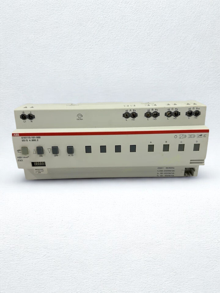 The ABB 6197/15-101-500, sometimes called 2CDG006197R0039 or UD/S 4.600.2, is a multichannel KNX universal dimming actuator that may be mounted on DIN rails in both home and industrial automation systems. It works with incandescent bulbs, 230V halogen bulbs, low-voltage halogen bulbs with regular or electronic transformers, and Philips retrofit LEDs with optimum dimming. It also has channel bridging for heavier loads. It is an MDRC device that can automatically detect loads, has 10 built-in logic channels for advanced features like light scenes and gates, and can be used manually even when there is no KNX bus voltage. This actuator is great for marine boats, industrial panels, and smart buildings. It makes lighting control more reliable while using less energy.