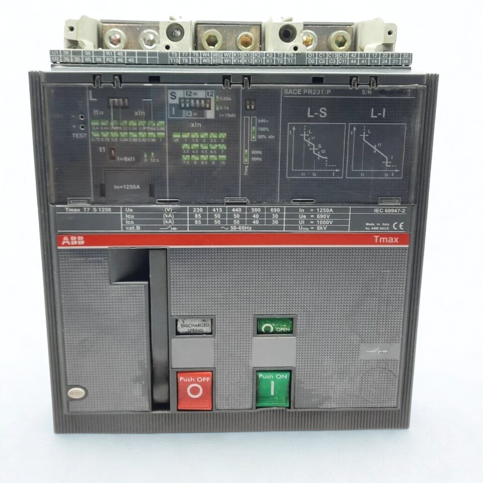ABB SACE Tmax T7S 1250 is a heavy‑duty 3‑pole molded case circuit breaker designed for reliable protection of low‑voltage power distribution systems up to 690 V AC with a rated current of 1250 A. Equipped with an electronic PR231/P LS/I trip unit, it provides precise long‑time, short‑time and instantaneous protection, making it suitable for use as a main or feeder breaker in industrial panels, switchboards and MCCs.