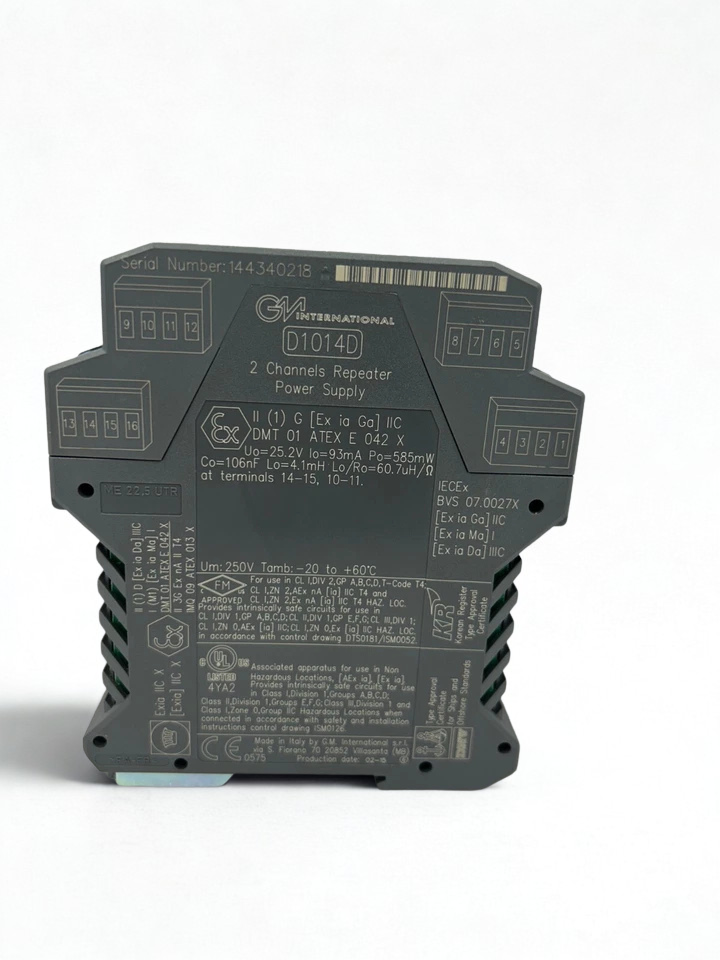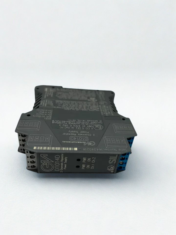 The GM International D1014D is a SIL 2 approved, two-channel repeater power supply made for analog input interfaces that need to be very reliable. It gives two 2-wire 4-20 mA conventional transmitters, which are often employed in dangerous regions, independent, fully floating DC power. The machine works with a supply voltage of 10 to 30 VDC, has a maximum power dissipation of 3.4 watts, and can communicate using HART protocols.