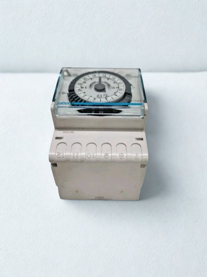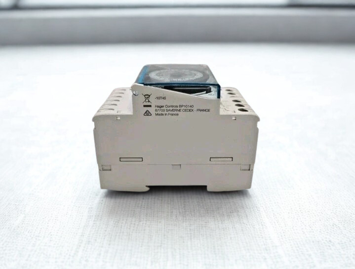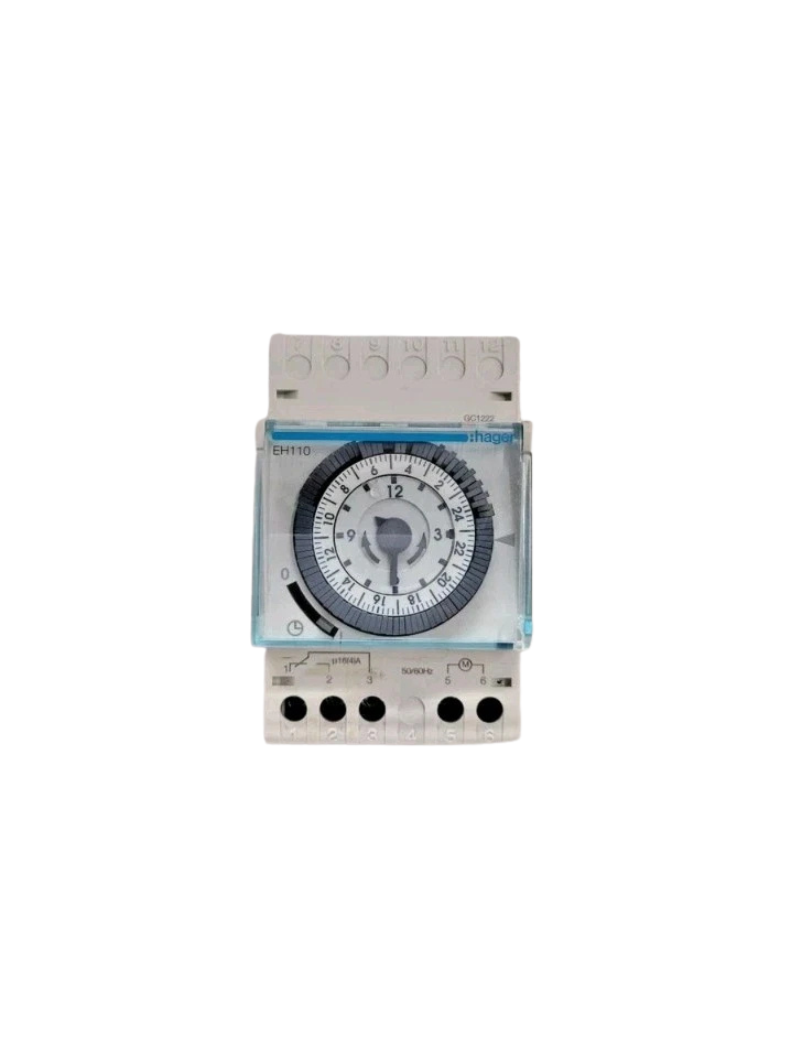 The Hager EH110 is a professional-grade, electromechanical analog time switch that lets you regulate a 24-hour cycle with great accuracy. This 1-channel timer is built to work reliably in both homes and businesses. It lets you automate electrical circuits without having to do complicated digital programming. It is a must-have for electricians who want a “set and forget” way to control lighting, heating, and power because it is well-built and fits on a 3-module DIN rail.