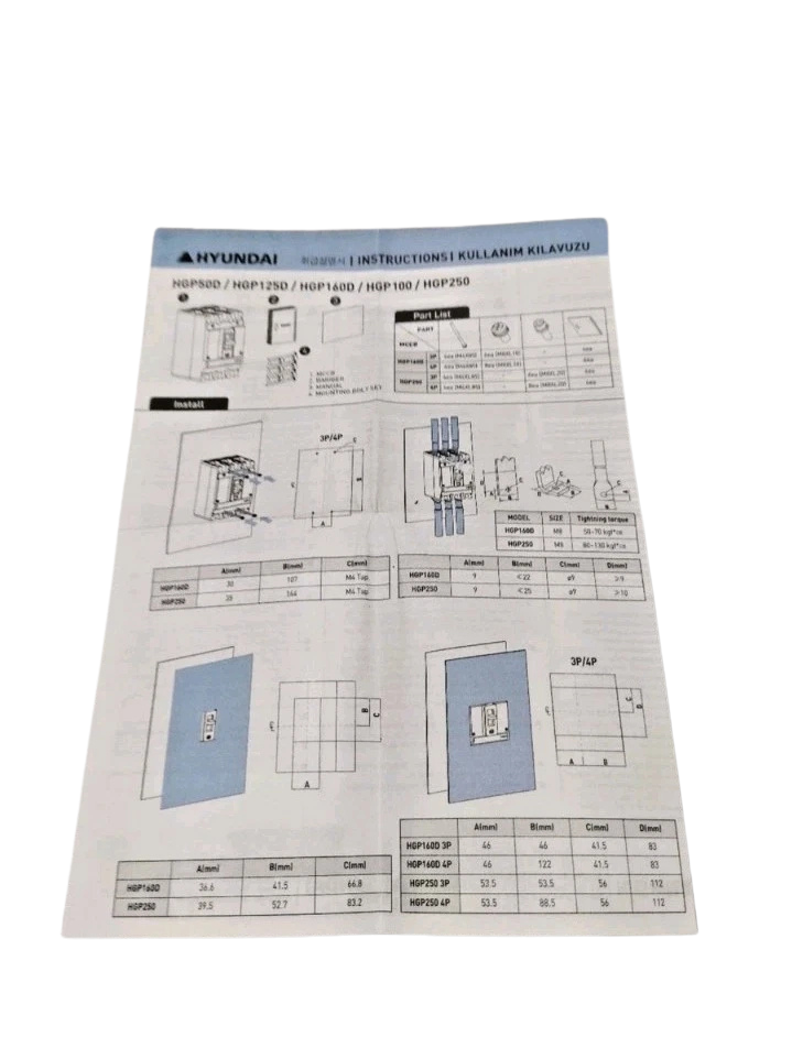 Side profile of the Hyundai HGP250NA MCCB showing the manufacturing label, EAC certification, and "Made in Korea" stamp with QR code Technical instruction sheet and installation manual for Hyundai HGP series circuit breakers showing mounting dimensions and torque specifications