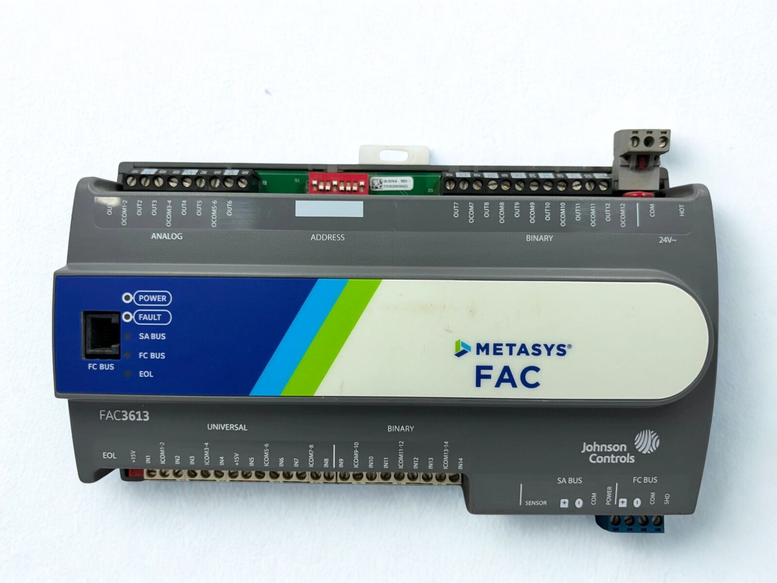 The MS-FAC3613-0C is one of the FAC family members included in Johnson Controls’ Advanced Application Field Equipment Controller catalog, which also lists compatible supervisory devices, network sensors, and software tools. When set up correctly on the BACnet MS/TP trunk, it can work with other Johnson Controls controllers and BACnet devices from other companies to provide a single building automation solution.