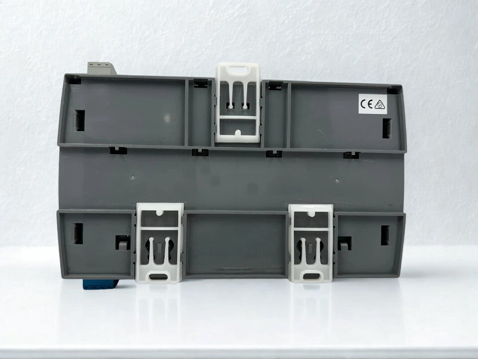 The controller has a wide range of universal inputs, binary inputs, analogue outputs, and binary outputs, so it can work with many different field devices like sensors, actuators, and relays. It has a small IP20-rated inclosure, can be mounted on a DIN rail or with screws, and has pluggable terminal blocks that make it easy to install and maintain in control panels and equipment rooms.