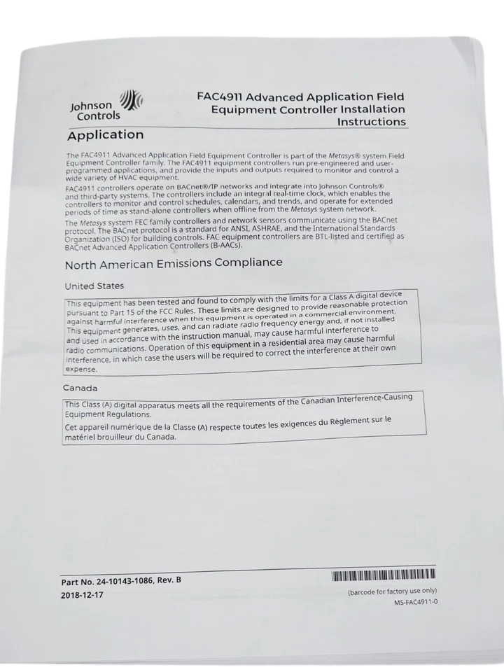The Johnson Controls MS-FAC4911-0 (Revision B) is a 28-point Advanced Application Field Equipment Controller (FAC) designed for the Metasys® system. This controller is made to work with BACnet®/IP and BACnet® Secure Connect (BACnet/SC) networks. It has advanced control logic for complicated HVAC systems and building automation. The MS-FAC4911-0 has a built-in real-time clock that lets it schedule, trend, and alarm on its own, so the system will still work even if the network goes down.