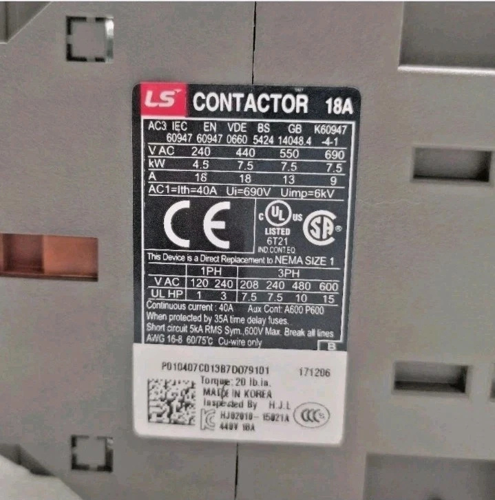 Technical nameplate of LS Metasol MC-18B contactor showing 18A rating, 10HP at 480V, and UL CE CSA certifications