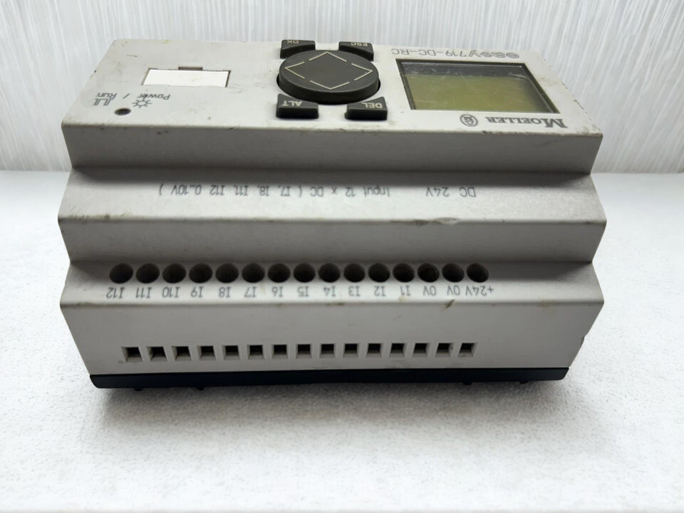The Eaton Moeller EASY700 series includes the EASY719-DC-RC. This series is noted for being reliable and having a programming interface that is easy to use. It runs on a 24 VDC power supply and has 12 digital inputs (four of which may be set up to work as analog inputs) and six relay outputs. The gadget has an LCD screen and a keyboard for easy setup, and it can also keep track of time in real time for time-based control.