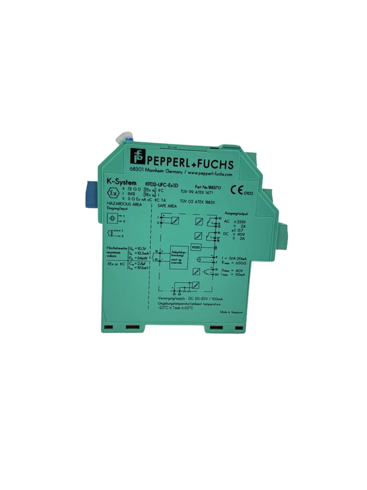 The KFD2-UFC-Ex1 from Pepperl+Fuchs.D is a 1-channel frequency converter that is safe to use on its own and has built-in trip values for accurate signal conditioning in dangerous regions. It changes frequency or pulse signals from NAMUR sensors or dry contacts into a proportional 0/4–20 mA analog output and at the same time gives customizable switching outputs for limit monitoring.