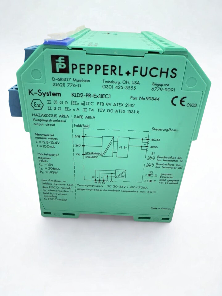 The Pepperl+Fuchs KLD2-PR-EX1.IEC1 (P/N: 99344) is a high-performance fieldbus power repeater from the K-System family. It is made to power and extend intrinsically safe fieldbus segments that meet IEC 61158-2 standards for PROFIBUS PA and FOUNDATION Fieldbus H1. It is certified to work with the FISCO model and can output 100 mA of current with signal repetition and galvanic isolation. This means that up to 10 field devices can work in dangerous Zone 1/2 locations without losing voltage over long distances. This little DIN-rail module makes sure that process automation for oil and gas, chemicals, and medicines can communicate reliably.