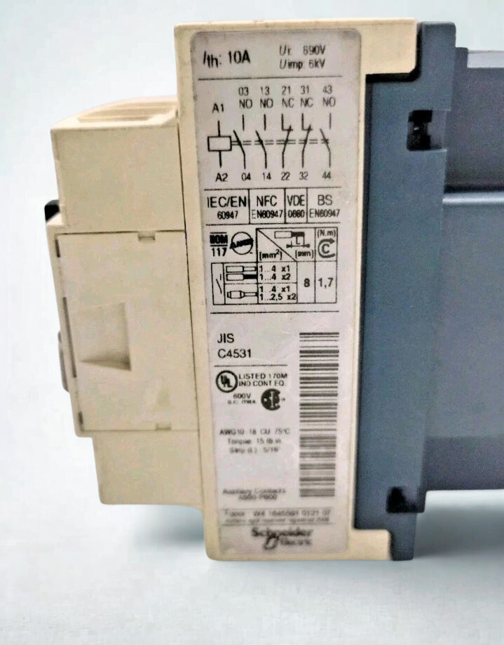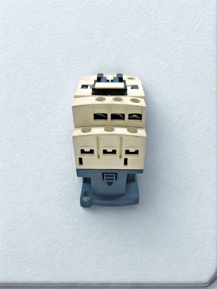 The CAD32 is made for controlling electromagnetic loads (AC-15/DC-13). It has 3 ordinarily open (NO) and 2 normally closed (NC) contacts and may be mounted on a DIN rail. Its worldwide AC coil lets it work well with all frequencies throughout the world without getting too hot. It works with TeSys D contactors and is easy to add on to with accessories for more complicated control logic.