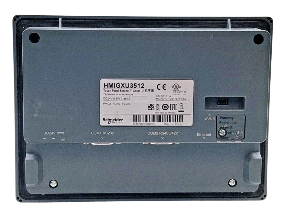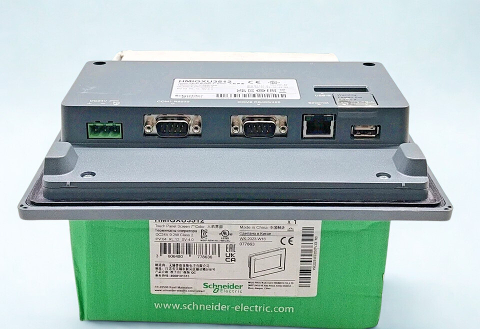 The HMIGXU3512 shines in manufacturing, water treatment, and energy sectors, interfacing with Schneider PLCs like Modicon M221 for HMI-SCADA setups. Its RS232/RS485 ports support legacy equipment, while Ethernet enables remote monitoring. For slanted mounts over 30°, limit ambient temperature to 40 °C to ensure optimal performance. RoHS compliant and Green Premium certified, it prioritizes eco-friendly industrial tech.