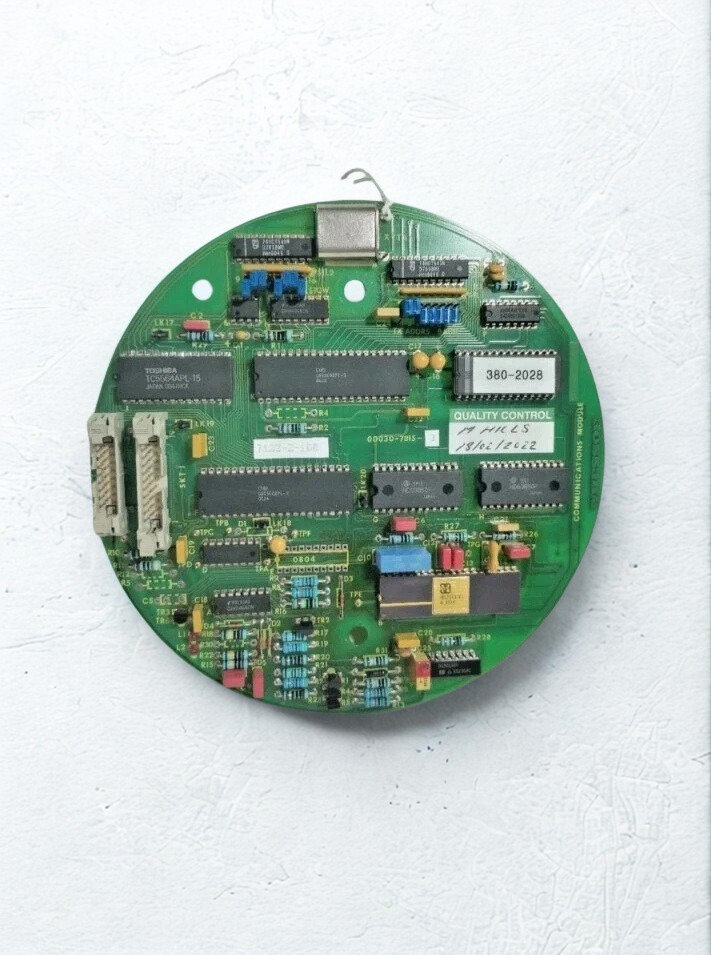 Detailed close-up of Whessoe 380-2028 Communication Module PCB showing Toshiba and CMS integrated circuits and circular green board design.
