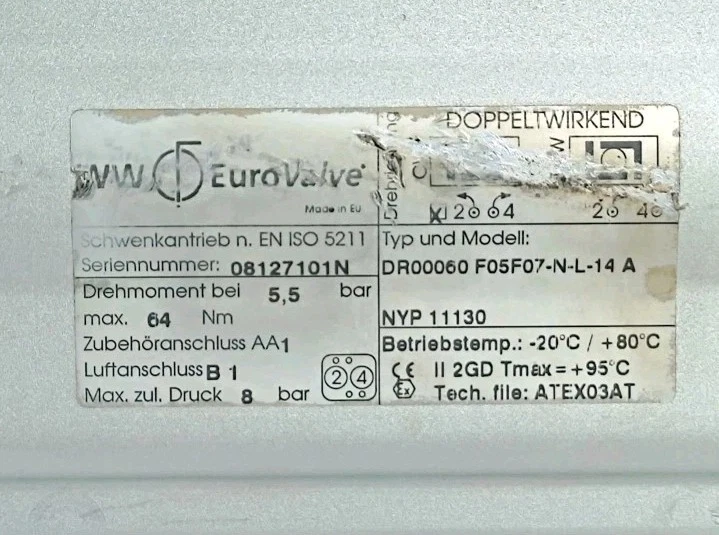 Full side profile of the Ww Eurovalve DR00060 aluminum pneumatic actuator for 2-inch ball valves. Ww Eurovalve DR00060 pneumatic actuator with black and yellow position indicator and dual air inlet ports. Technical nameplate for Ww Eurovalve DR00060 F05F07-N-L-14 A showing 64 Nm torque and ATEX certification details